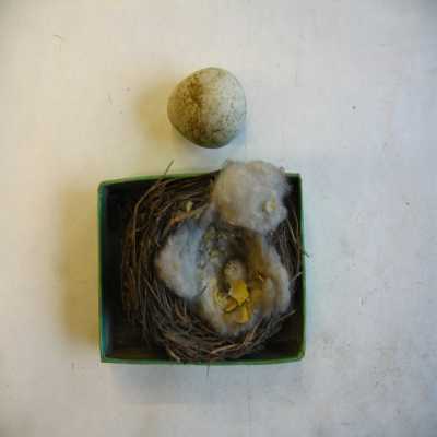 Nido pequeño formado por pajas y ramitas secas entrelazadas. En el centro algodón. Se observan fragmentos de huevos pequeños, de color blanco sucio moteado de gris, y sobre estos fragmentos un huevo más grande roto por ambos extremos, de color blanco sucio con puntitos y manchas verdosas.