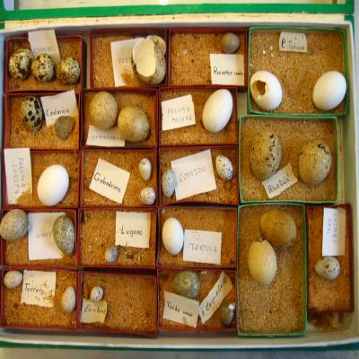 En una caja-expositor con la tapa de cristal. Dentro hay cajitas donde se disponen los huevos, con un papel con el nombre del ave al que corresponden escrito con bolígrafo.