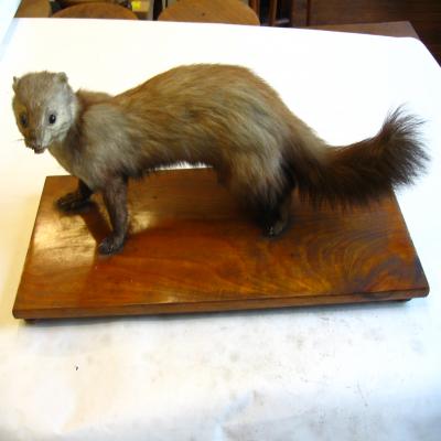Un ejemplar naturalizado. Cuerpo alargado, con babero blanco que continúa hasta la base de las extermidades delanteras, formando una bifurcación en el pelaje. El resto del pelaje es pardo claro, con una macha que sube hasta la mitad del pecho. Cola larga y empenachada. Borde de las orejas blanco. Nariz de color claro.