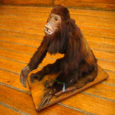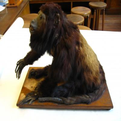 Un ejemplar naturalizado. Mono mediano, sentado, con un brazo apoyado y el otro extendido. Falanges largas. Se pueden observar los pulgares prensiles. Rostro prognato, labios gruesos y fuertes colmillos. Está con la boca abierta. Pelaje pelirrojo, con el dorso más anaranjado. El vientre ha perdido el pelaje. Cola larga.