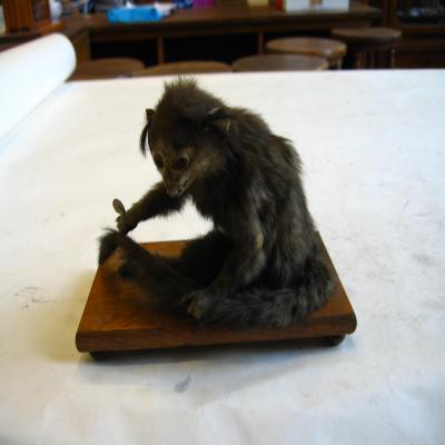 Un ejemplar naturalizado. Mono muy pequeño, sentado, cogiéndose la cola con una mano. Cara de color claro, prognata, con caninos fuertes. El resto de la coloración es parda oscura. Tiene una especie de mechones en las orejas. Cola larga.
