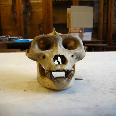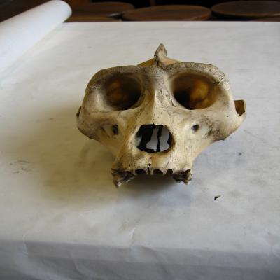 Gran mono de Gabon. Se cree que sólo hay otros dos cráneos conservados de este mono, ambos en el Museo Británico. Este se considera el mejor conservado.