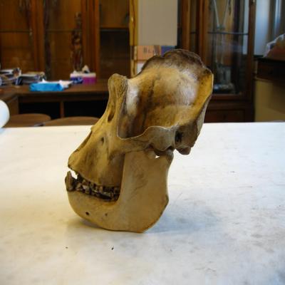 Cráneo (ICC4-ZOO-1358.1)con su mandíbula de Gorilla (ICC4-ZOO-1358.2) (gran mono de Gabon), de África. Cara prominente, con dientes fuertes (sólo se conservan molares y caninos). Marcada cresta supraorbital. Elevada cresta frontal que se une con otra occipital en la parte posterior de la cabeza.