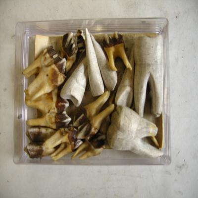 -Nueve molares de vertebrados. Parecen molares hipsodontos, típicos de herbívoros (gran desgaste).