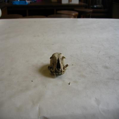 Cráneo de gato, pequeño, con todos los dientes conservados, aunque un canino está partido. Posee por cada lado tres incisivos, un canino, tres premolares y un molar pequqño. Muelas tipo carnívoros. Arcos rotos.