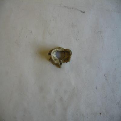 Vértebra de mamífero. Se distingue: el cuerpo vertebral, unas prominencias laterales (apófisis transversas), y en el cuerpo central el canal medular. Está un poco rota.