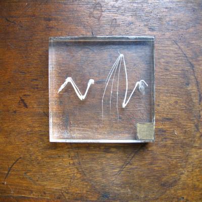 Expositor de plástico transparente que contiene dentro las piezas. Lleva una pequeña etiqueta muy desgastada, con inscripción apenas legible a lápiz: "A-25".