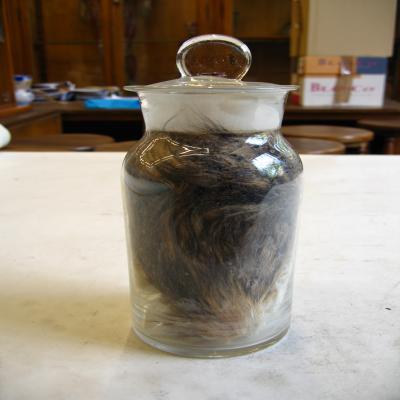 Piel de mamífero. Está enrollada. Pelaje largo, suave, con zonas paro claro, otras oscuro y también blancas.