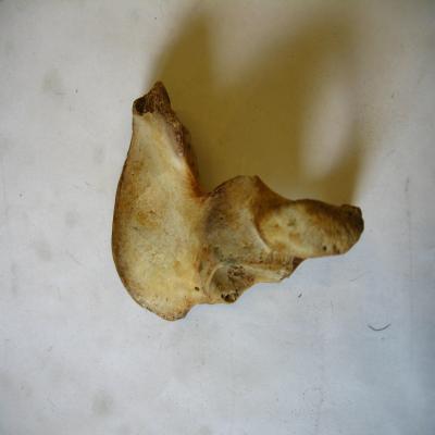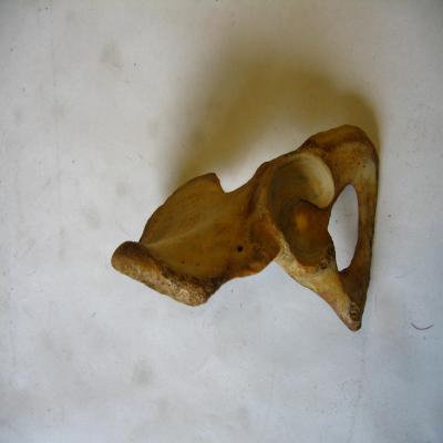 Hueso de la pelvis izquierdo humano. Hueso plano, pero girado 90º hacia la mitad. Las partes que se disitnguen son: Ileon (la partes más ancha), pubis, isquion (la parte del arco) y el agujero obturado. En la cara externa el hueco donde se articula el fémur. Color oscurecido.
