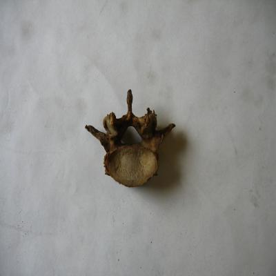 Vértebra humana. En una visión superior, se distingue: el cuerpo vertebral, unas prominencias laterales (apófisis transversas) y una prominencia posterior (apófisis espinosa), unidas por la lámina. El agujero central está ocupado por la médula, por lo que se denomina canal medular. Está muy oscurecida, color parduzco.