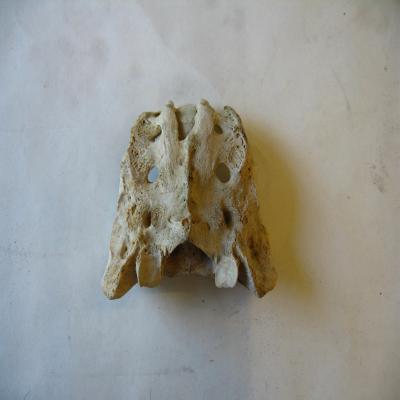 Con cuatro pares de agujeros en fila. En la parte superior un disco plano a través de la cual se une a otra vértebra, y a los lados de este dos alas. Color amarillento.