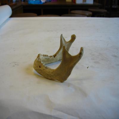 Mandíbula humana. Es muy ancha y grande, robusta. No conserva ningún diente. Color algo amarillento.