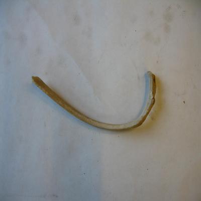Costilla humana. No muy grande. Es un hueso alargado, curvado a modo de gancho. El extremo con zona articular se une a una vértebra.