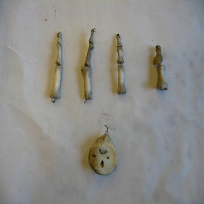 -Sobre la base donde se asienta el soporte que mantiene al esqueleto hay una pequeña bolsa de plástico que contiene falanges de cuatro dedos que aun se mantienen unidas, y la rótula izquierda.