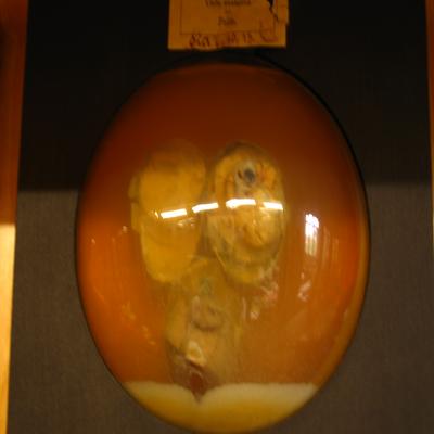-Primer huevo (7 días): No está diferenciado aún el embrión, se observa vitelo, que se ha desprendido en parte, enturbiando el líquido en el que se encuentra la muestra.