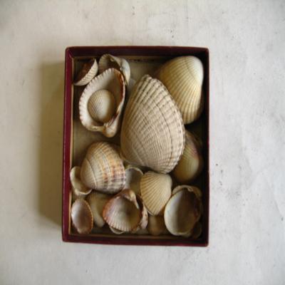 Más de diez valvas de diferentes tamaños, algo inequilaterales, con uno de los lados más planos. Abombadas con amplios umbos que se elevan bien por encima de la línea de la charnela. Superficie con costillas radiales planoredondeadas y también se observan estrías concéntricas. Borde mellado. La mayoría son blancas, aunque también las hay pardas.