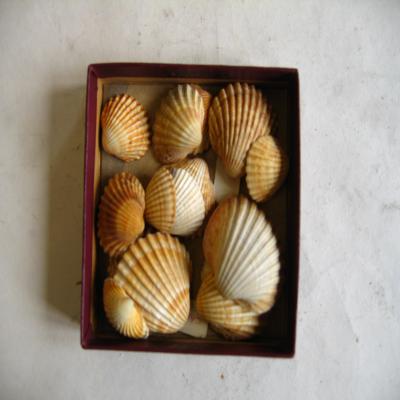 Más de diez valvas de diferentes tamaños, algo inequilaterales, con uno de los lados más planos. Abombadas con amplios umbos que se elevan bien por encima de la línea de la charnela. Superficie con costillas radiales algo planas. Borde mellado. La mayoría son pardas, con bandas concéntricas más oscuras; también hay valvas más claras.