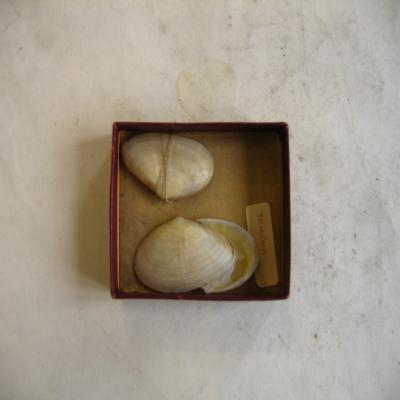 Dos ejemplares completos, uno de ellos está unido por una cuerda. Triangulares, aplanadas lateralmente, finas, inequilaterales. Las valvas de un mismo ejemplar son muy parecidas, aunque una es un poco más plana. Uno de los lados es más largo y apuntado. Muchas líneas concéntricas. Color blanco. Seno paleal amplio.