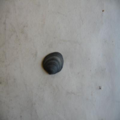 Valva oval irregular, inequilateral, ya que un lateral es más apuntado. Umbo inclinado. Color gris con bandas concéntricas grises más oscuras. También se observan estrías radiales. Interior gris sucio con surco paleal e impresiones musculares que parecen iguales.