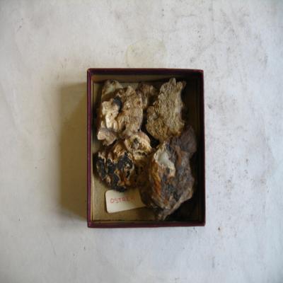 En una cajita, con una etiqueta dentro con inscripción a bolígrafo: "OSTREA".