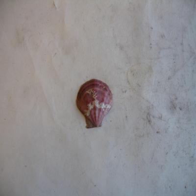 Una valva, algo abombada, en abanico, con aurículas (una está rota). Posee varias costillas radiales gruesas. Color púrpura. Los bordes no muy marcados, corresponden al contorno de las costillas y los valles dejados por ellas. Zona interior clara, con zona púrpura en el centro y líneas gruesas pardas concéntricas.