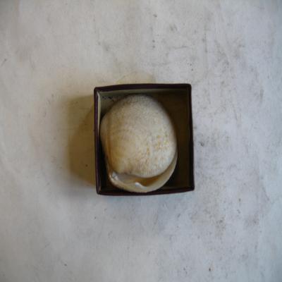 Las dos valvas del mismo ejemplar. Redondas, con umbo un poco elevado y muy poco inclinado. Uno de los laterales con inclinación del borde. Escultura concéntrica formada por líneas y una red de escamas dispuestas alternadas. Parecen observarse también pequeñas manchitas pardas radiales. Color blanco. Interior blanco con manchas pardas claro. Seno paleal muy grande y apuntado. Dos manchas musculares, una de ellas alargada.