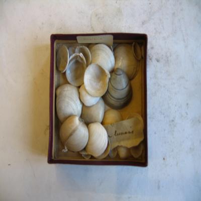 En una cajita, con una etiqueta dentro con inscripción a bolígrafo: "DOSINIA", y otra "Dosinia lunaris".