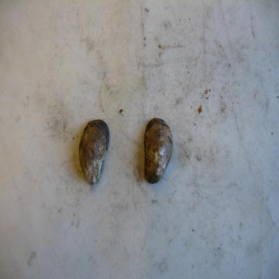 Dos valvas del mismo ejemplar. Forma alargada, con vértice terminal. Son inequilaterales, con un extremo más ancho esquinado. Líneas radiales por la superficie. Color negro-violáceo. Interior blanco-violáceo, más oscuro por los extremos. Se observa una marca muscular en un lateral. Borde interno rayado.