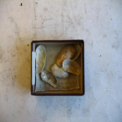 En una cajita, con una etiqueta dentro con inscripción a bolígrafo: "PANDORA" y otra "Pandora inaequivalvis. S. Sebastian".