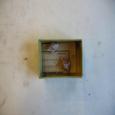En una cajita, con una etiqueta antigua con inscripción a máquina: "35. INSTITUTO <<JOSÉ DE ACOSTA>>. Museo Nacional de Ciencias Naturales. MADRID (6). Colecciones suministradas a los Establecimientos Oficiales de Enseñanza. Gén. Columbella. Espec. mercatoria L. Localidad: Cuba"
