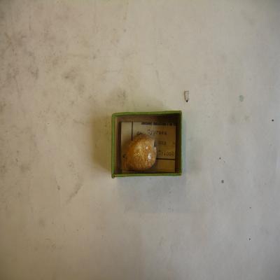 En una cajita, con una etiqueta antigua con inscripción a máquina: "62. INSTITUTO <<JOSÉ DE ACOSTA>>. Museo Nacional de Ciencias Naturales. MADRID (6). Colecciones suministradas a los Establecimientos Oficiales de Enseñanza. Gén. Cypraea. Espec. mus Linné Localidad: Colombia"