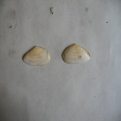 Dos valvas que pertenecen al mismo ejemplar, oval-alargadas, simétricas pero inequilaterales, con un lado largo y apuntado y umbo algo inclinado. Líneas de crecimiento concéntricas. Color blanco con la zona cercana al umbo color crema. Interior blanco con manchas amarillentas, con gran seno paleal y dos marcas musculares similares.