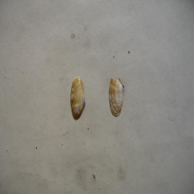 Dos valvas que pertenecen al mismo ejemplar. Oval- alargadas, simétricas. Cada valva es inequilateral, con el umbo algo inclinado y un lado más largo y redondeado. Líneas concéntricas de crecimiento. Color pardo, con el umbo violáceo y bandas radiales blancas. Interior violáceo, seno paleal y borde interno dentado.