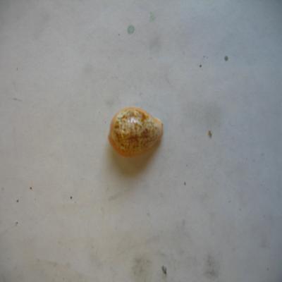 Concha ovoide, gruesa, con el dorso abombado, con los lados reforzados y el lado ventral plano. Brillante. Dorso de base crema con manchitas pardas, y los laterales anaranjados.Lado basal blanco. Labios dentados, aunque el interno muy poco apreciable; boca muy estrecha y larga, abierta por los dos extermos.