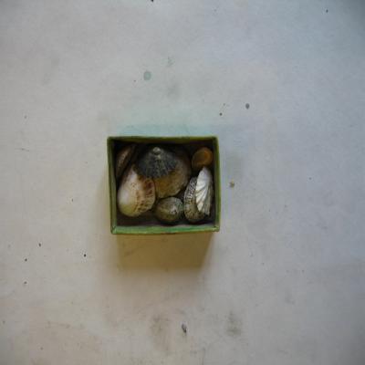 Una de las conchas tiene pegada una etiqueta con inscripción a bolígrafo "PATELLA aspera".