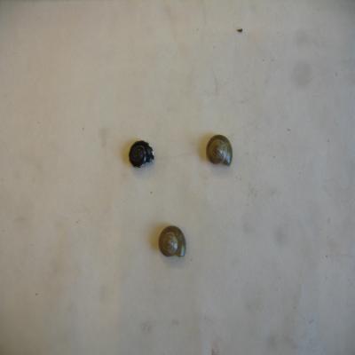 Tres conchas, bastante lenticulares, de ápice muy bajo. Superficie lisa, brillante, con estrías axiales. Una es de color negro-parduzco con una línea espiral con manchas negras-parduzcas y crema alternas; las otras dos son como grisáceas con muchas pequeñas motitas verdosas. La cara basal en oscura en dos y blanca en otra. Ombligo cubierto por una callosidad. Boca ovalada, interior nacarado.