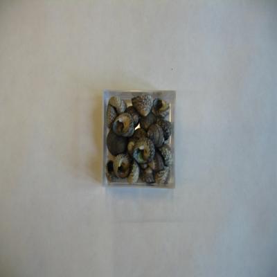 En una cajita, con un papel con inscripción a bolígrafo: "25 ejemplares. Género de la familia Trochidae. Parece género Tectus. Superfam: Trochacea. Prosobranchia: Diotocardia [Orden]. Archaeogastropoda.