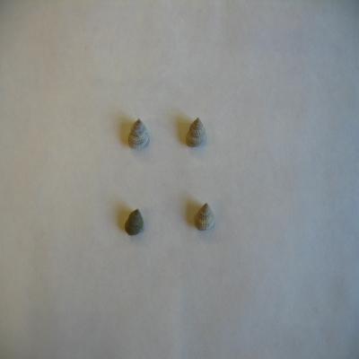 Molusco. Clase Gasteropodo. O. Mesogasterópodos. Fam. Littorinidae Cuatro conchas globosas, de ápice alto y última espira más ancha. Sutura marcada. Posee varias costillas espirales por espira, con escamas. Pequeño ombligo. Color grisáceo o verdoso. Boca redondeada, con interior pardo.