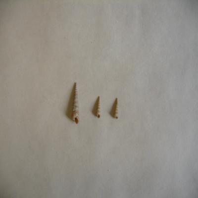 3 ejemplares de diferente tamaño. Concha muy piramidal, muy alargada, con bastantes vueltas regularmente abombadas con costillas espirales. Color blanco-grisáceo. Boca oval, interior claro, algo translúcido.