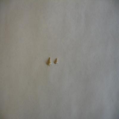 Molusco. Clase Gasteropodo. O. Mesogasterópodos. Fam. Epitoniidae (Scalariidae) Dos ejemplares. Conchas cónico-puntiagudas, con espiras abombadas. Costillas axiales muy marcadas. Color blanco. Boca redonda. Interior blanco. El ejemplar más grande tiene roto parte del labio externo.