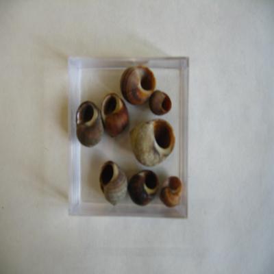 Ocho ejemplares. Concha oval-redondeada, con estrías espirales. Colores pardos y marrones (menos un ejemplar que está grisáceo por el desgaste), con líneas espirales, y en algunos también axiales más oscuras. Boca oval apuntada por arriba, interior pardo.