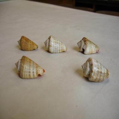 Molusco. Clase Gasteropoda. O. Mesogasterópodos. Fam. Strombidae Cinco ejemplares. Concha fusiforme, de ápice no muy alto. Blanca con franjas espirales de manchas pardas. Boca alargada, abierta por abajo.Callosidad de la columela pardo negrosa, labio interno color carne, con una pequeña escotadura en la zona posterior. Uno de los ejemplares tiene la boca tapada con sustrato y está roto por la zona del labio externo. Otros dos también tiene rota esa zona.