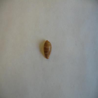 Concha piriforme, con la última espira que parece cubrir el resto. Superficie algo desgastada. Coloración del dorso clara con franjas transversales pardas, con la base y márgenes anaranjados. Labios dentados, boca muy estrecha y larga. Interior claro.
