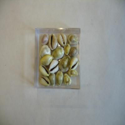 En una cajita, con un papel con inscripción a bolígrafo: "[Cypraea] 16 ejemplares. Monetaria moneta [Linné 1758] (variedades). Costa oriental africana hasta islas Galápagos".