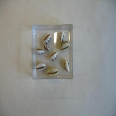 En una cajita, con un papel con inscripción a bolígrafo: "[Cypraea] Palmadusta asellus [Linné 1758] Lam. 22. pg.154 nº16. 9 ejemplares (3 bandas pardo-negruzcas)".