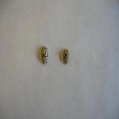 Dos ejemplares. Concha oval-alargada, abombada dorsalemente, base aplanada. La última vuelta cubre las anteriores. Superficie brillante. Dorso claro, con tres franjas grisáceas, puntitos pardos por toda la superficie y una mancha irregular aprda en el centro. Laterales y base blancos. Labios dentados, interior también oscuro. Boca alargada, estrecha, pero más ancha por abajo, abierta por los dos extremos.