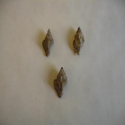 Molusco. Clase Gasteropoda. O. Neogasteropodos. Fam. Buccinidae Tres ejemplares. Concha fusiforme, barriguada. Ápice elevado, costillas espirales y otras más marcadas axiales. Color grisáceo. Boca ovoide, apuntada por arriba y abierta por abajo a un corto canal sifonal. Interior claro. En uno está muy desarrollada la columela, lisa y blanca brillante, al igual que el interior de la boca. Labio externo protegido por una costilla axial, y por dentro dentado.