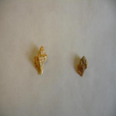 Molusco. Clase Gasteropoda. O. Neogasteropodos. Fam. Muricidae Dos ejemplares. Dos conchas fusiformes, barrigudas, de espiras redondeadas, y ápice alto. Costillas espirales y axiales., también estrías axiales. Colores amarillento o pardo. Boca ovalada, corto canal sifonal. Interior claro. Pequeña callosidad en la columela lisa y clara. Labio externo aplanado externamente, con una serie de prolongaciones que corresponden a las costillas espirales.