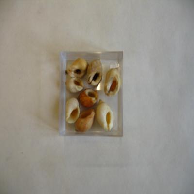 En una cajita, con un papel con inscripción a bolígrafo: "Nucella sp. Fam. Thaididae 8 ejemplares y Nucella sp. 4 ejemplares".