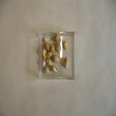 14 ejemplares. Concha piriforme, pequeña, y ápice alto. Color claro, algunos con manchas pardas. Boca alargada, abierta por abajo. Ambos labios dentados internamente. Interior claro.